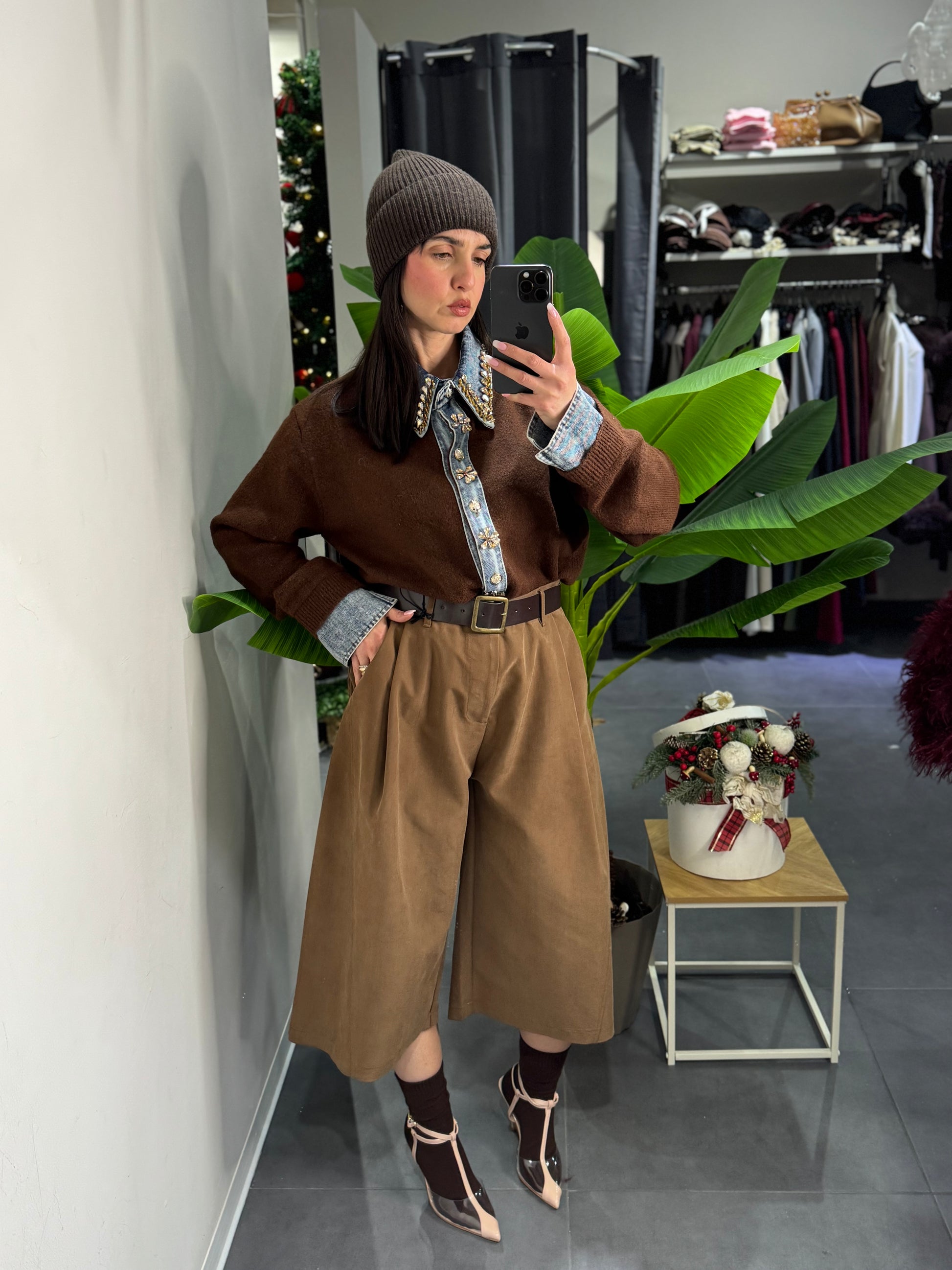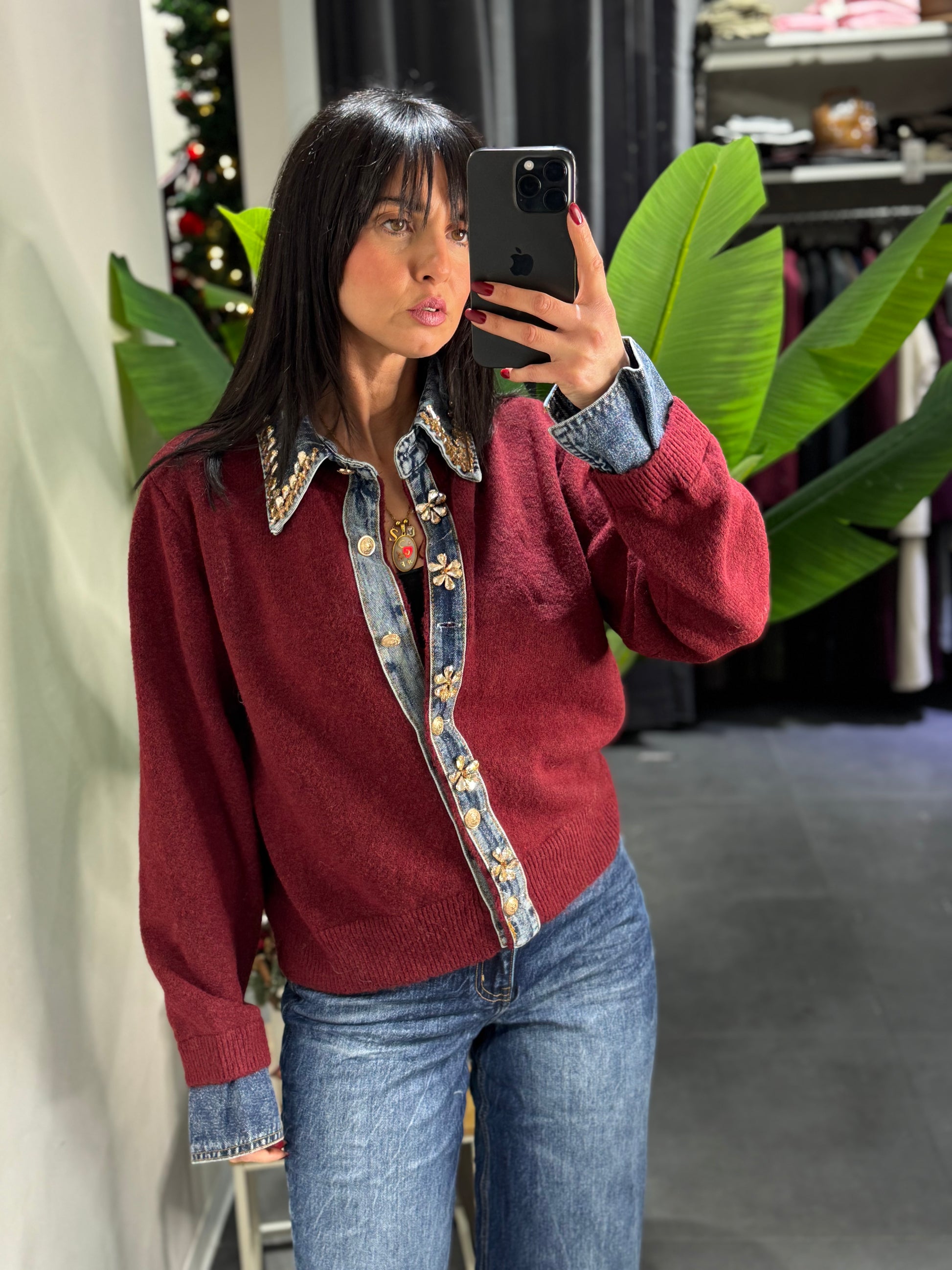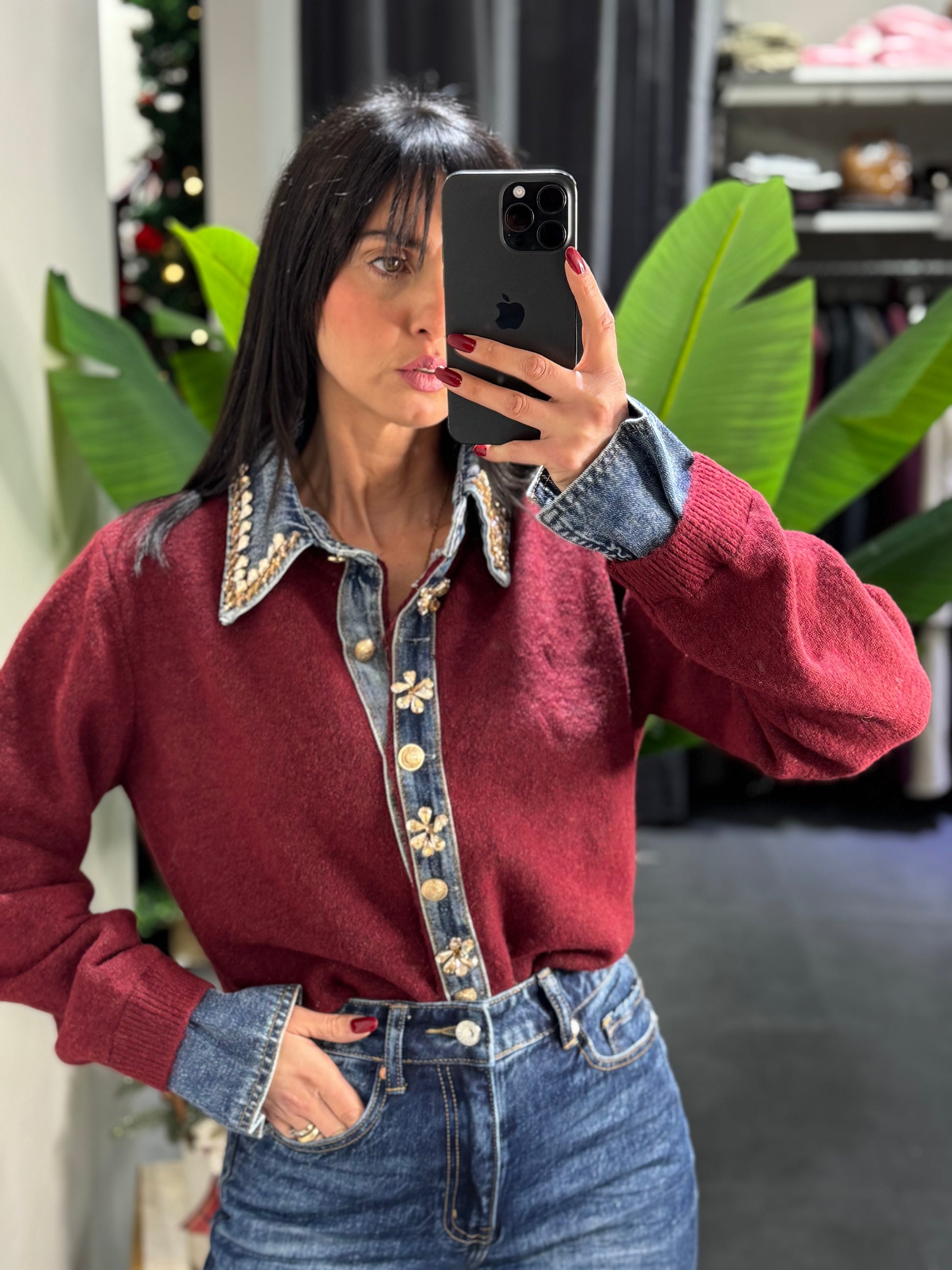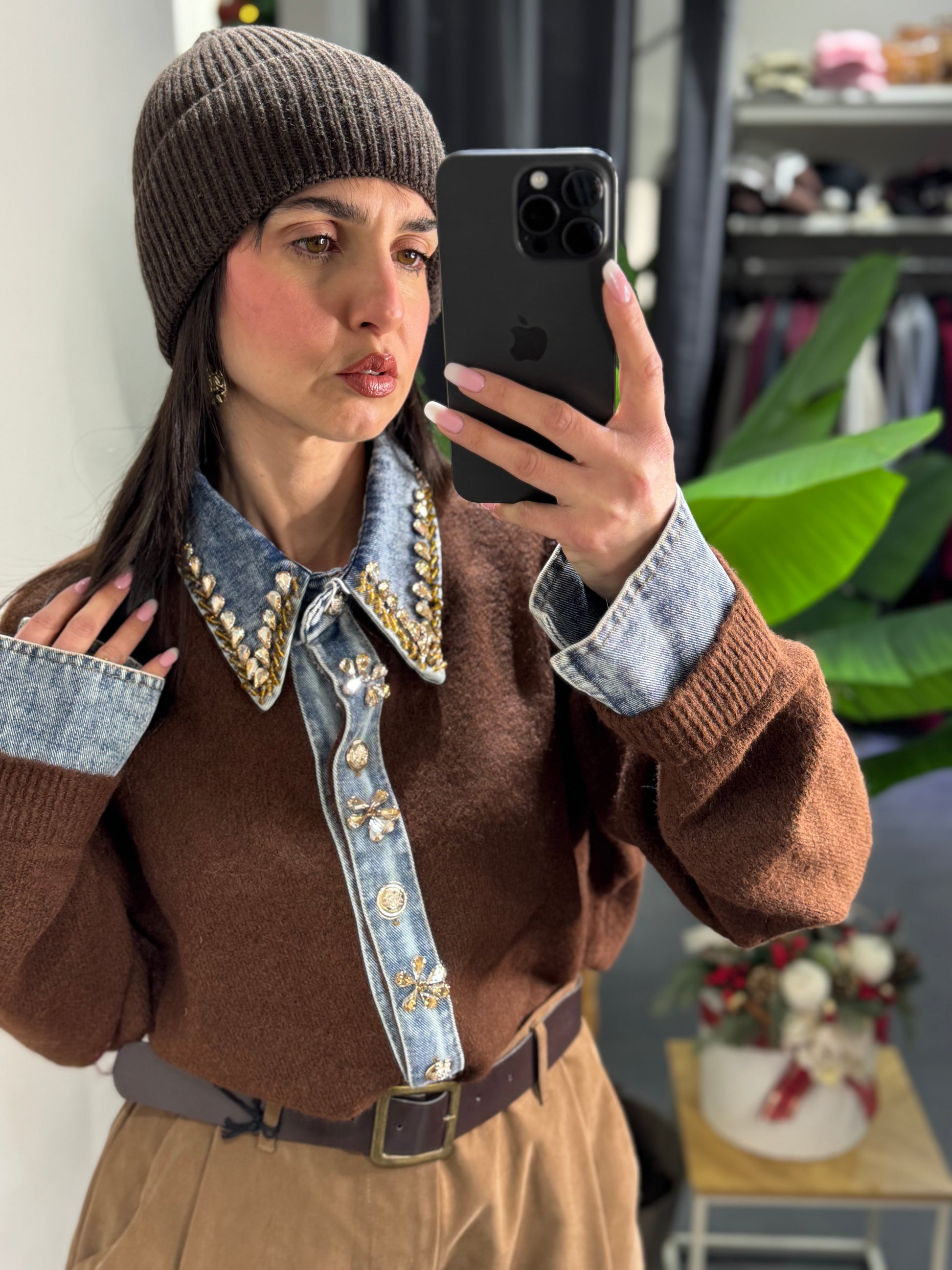 fon applicazioni in strass e dettagli in denim sul polso e sul davanti